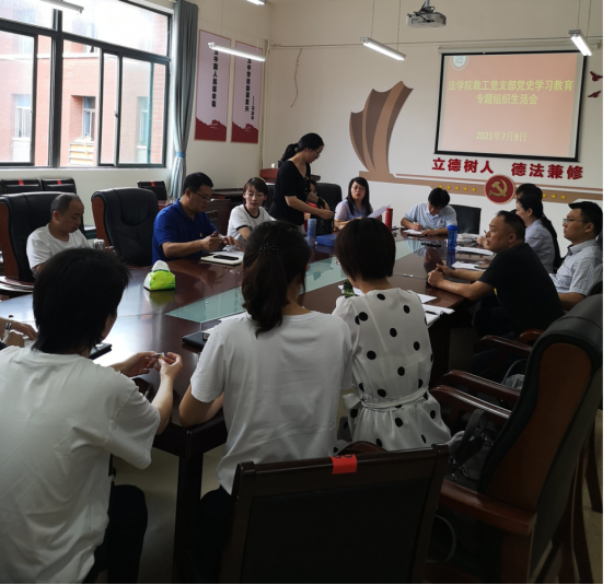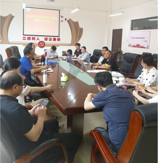 (法学院/图文 母桂花)2021年7月9日,法学院教工党支部在文德楼A8-310会议室召开党史学习教育专题组织生活会。会议由教工党支部书记曹务坤同志主持。