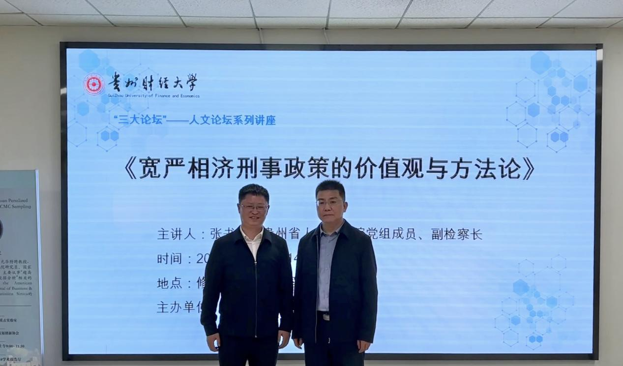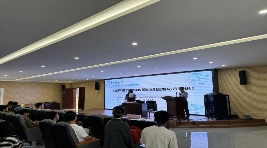 (法学院 钟佳昕 报道/摄影 申思圆 )为提升研究生的实务和科研能力,加强研究生与实务专家的深入交流,5月14日,由法学院主办,校团委协办的“三大论坛”——人文论坛系列讲座《宽严相济刑事政策的价值观和方法论》在修德楼318会议室举行。本次讲座有幸邀请到诉讼法学博士、经济学博士后、历任最高人民检察院公诉厅副处长、现挂职贵州省人民检察院党组成员、副检察长张书铭为主讲人。法学院党委副书记、院长陈玉梅,党委委员、副院长宋昭澜,学生120余人参加了讲座,讲座由宋昭澜主持。