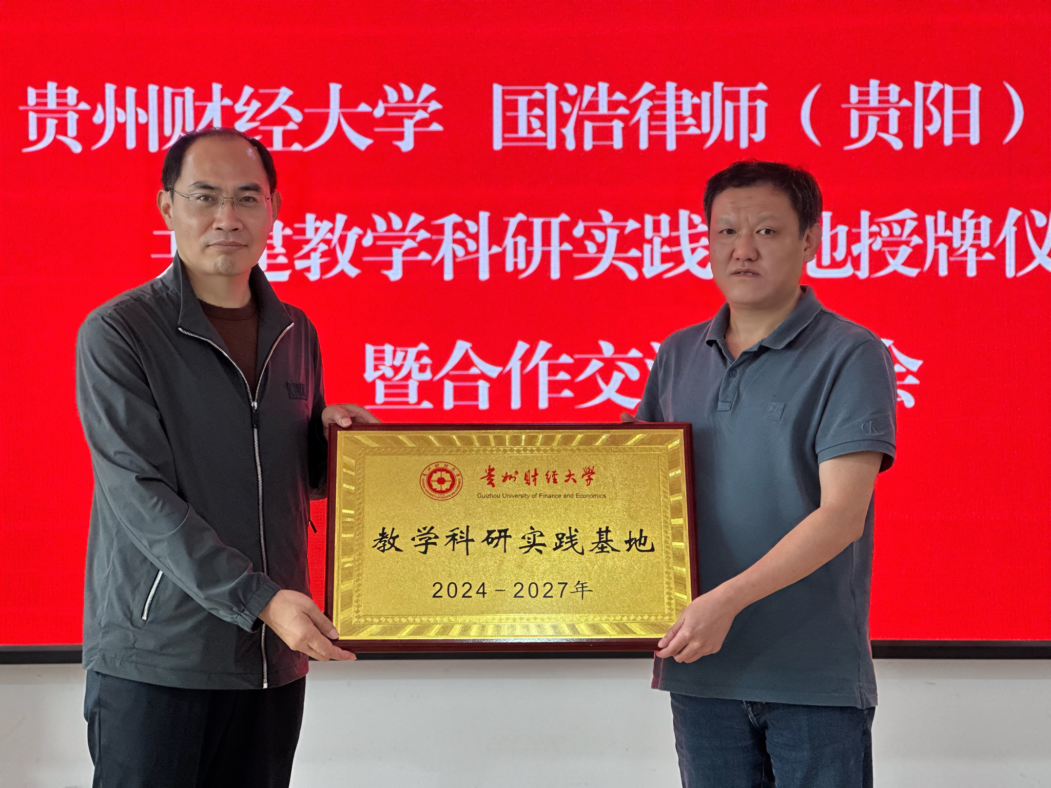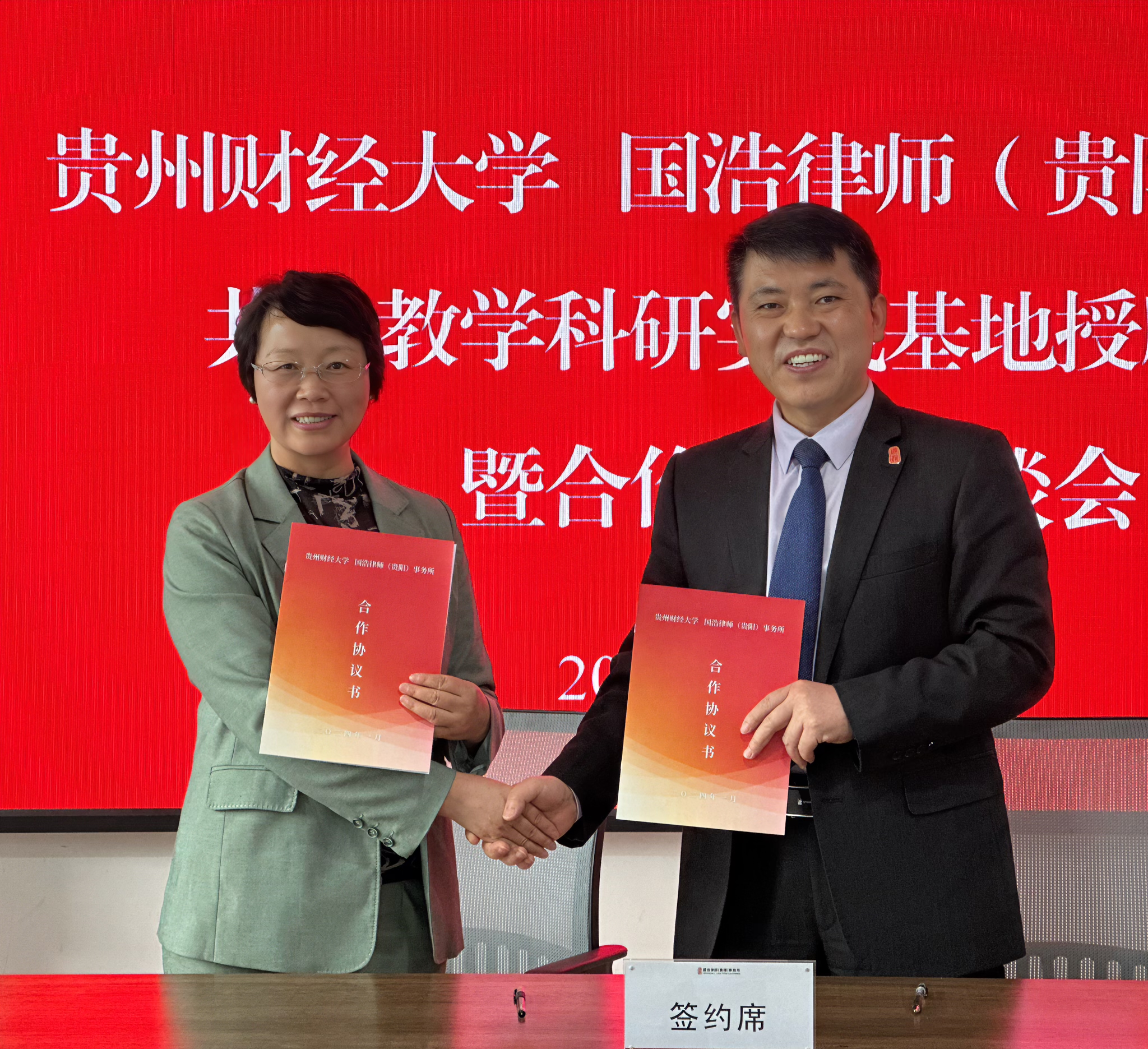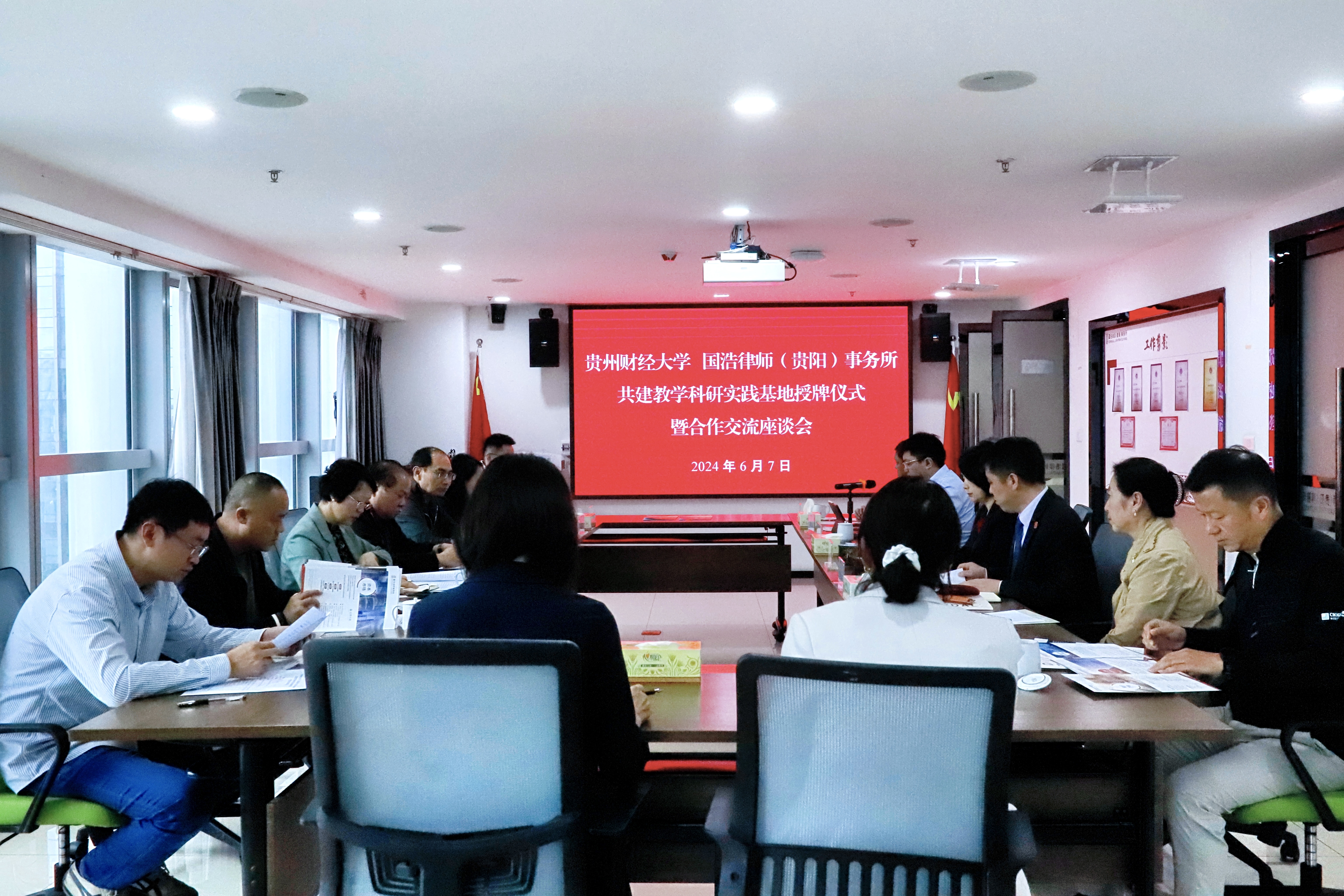 (法学院 王霖 图文/报道)2024年6月8日下午,贵州财经大学特聘教授、贵州省社会科学院原党委书记吴大华;开云手机平台党委书记邵新顺,党委副书记、院长陈玉梅一行前往国浩律师(贵阳)事务所(以下简称为“国浩贵阳律所”),举行共建教学科研实践基地授牌仪式暨合作交流座谈会。贵州省律师协会会长、国浩贵阳律所合伙人白敏;国浩贵阳律所主任、管理合伙人郑世红,党支部书记、管理合伙人兰钢等人员出席会议。会议由国浩贵阳律所管理合伙人潘志成主持。双方就党建工作开展、法商融合型人才培养、科研合作创新、实践成果转换等问题进行了深入交流。