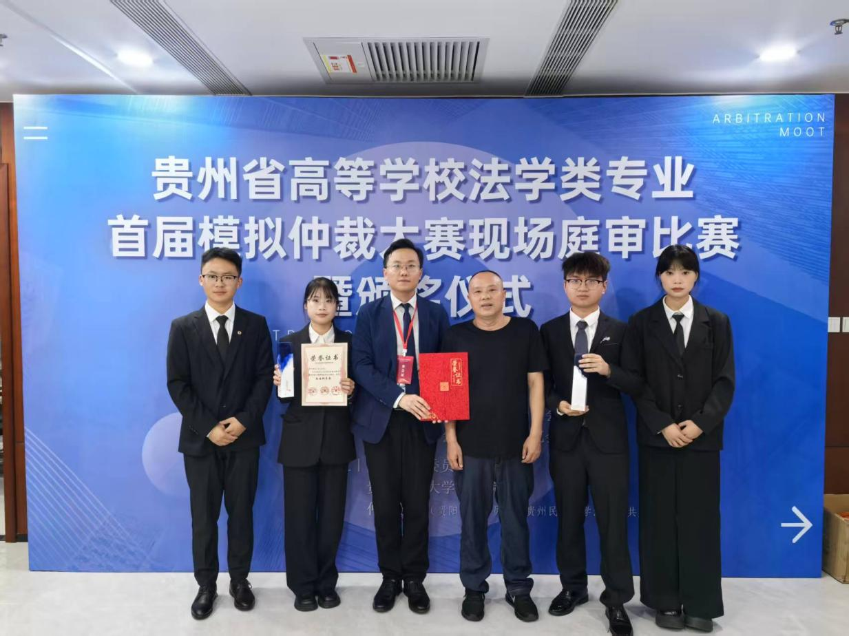 (法学院 饶子豪 报道、摄影)2025年9月27日,由贵州省法学会法学教育研究会、贵州省法学会仲裁法学研究会联合主办,贵阳仲裁委员会、贵州民族大学法学院及仲裁学院(贵阳仲裁委员会、贵州民族大学共建)共同承办的“贵州省高等学校法学类专业首届模拟仲裁大赛”盛大举行。本次赛事汇聚了来自省内14所高校的精英队伍,经过激烈角逐,开云手机平台法学院代表队凭借扎实的专业功底与卓越的团队协作能力脱颖而出,最终荣膺季军。