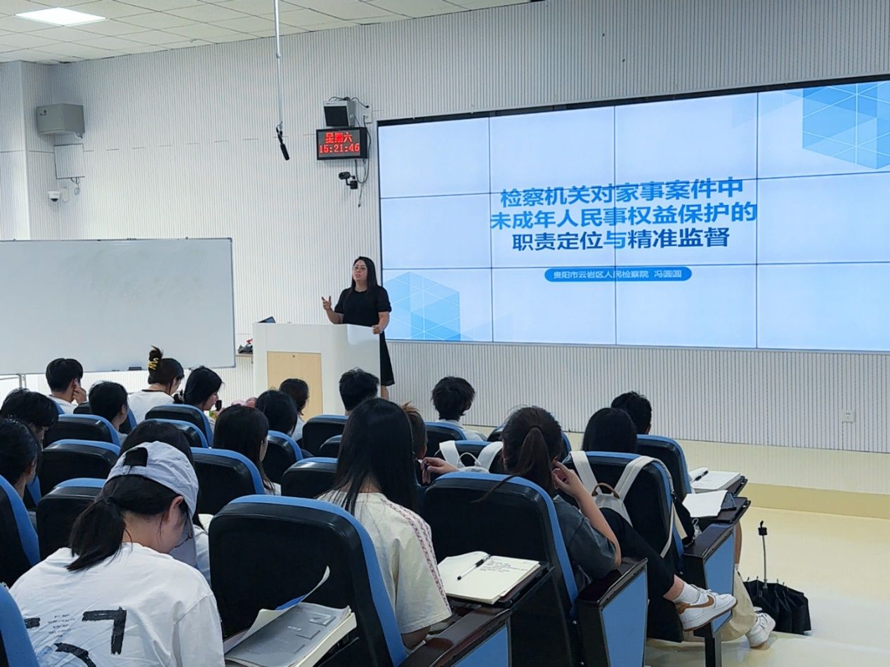 (法学院 王紫微 刘媛 图文报道)9月9日下午,开云手机平台“三大论坛”之人文论坛、贵州省人民检察院“检察实务专家进校园”系列课程第二讲在乐学楼成功举办。本次讲座特邀贵阳市云岩区人民检察院检委会专职委员、一级检察官冯圆圆,以“检察机关对家事案件中未成年人民事权益保护的职责定位与精准监督”为主题进行授课,法学院副院长宋昭澜主持讲座,百余名师生到场聆听、交流。